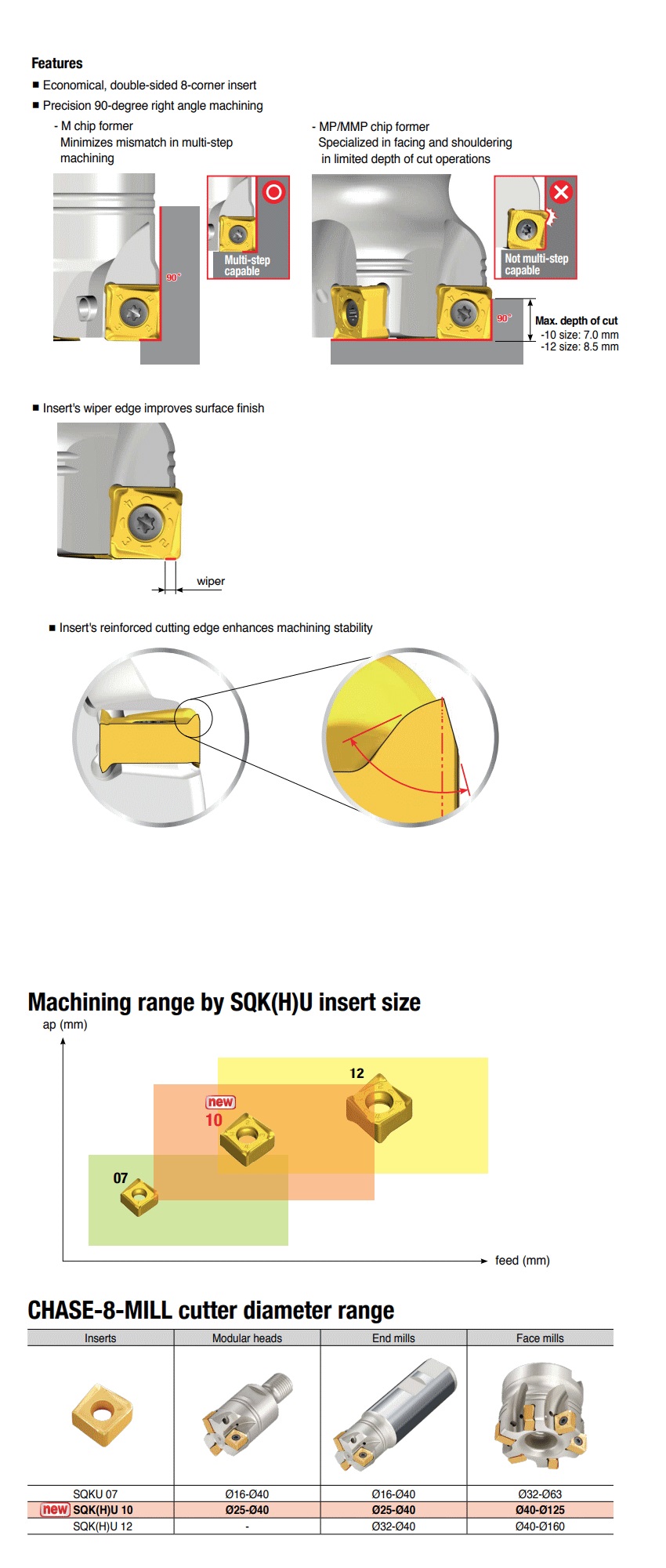 90° End mills with 8 cutting edges of double-sided Square inserts SQK(H)U 10 for general milling