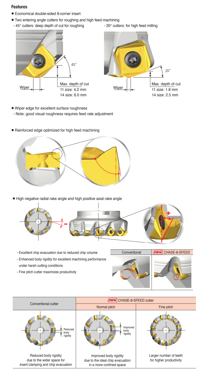 20° Face mills with 8 cutting edges of double-sided Square inserts SQKU 11 for high feed machining