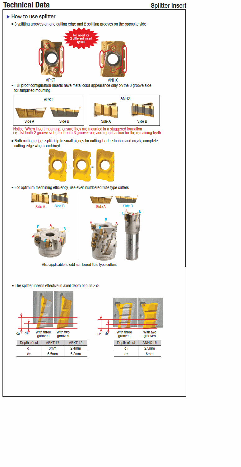 Positive chip splitter inserts of APKT 17 with two helical cutting edges & high positive rake for 90° shoulders and 3 splitting grooves on one side & 2 splitting grooves on the opposite