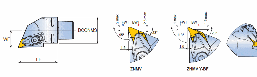 C-ADAPTER T-holders for high pressure coolant with ZNMV 4 corner inserts for multi directional and high feed turning