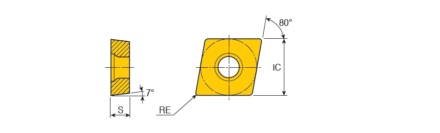 Positive 80° Rhombic inserts for medium to medium rough applications of steel, stainless steel and cast iron with 7° clearance angle