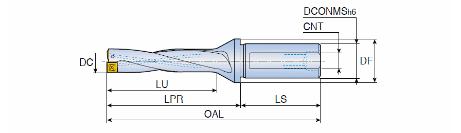 Indexable drills with square inserts & enlarged chip gullet from twist coolant holes in drilling depth of 4xD