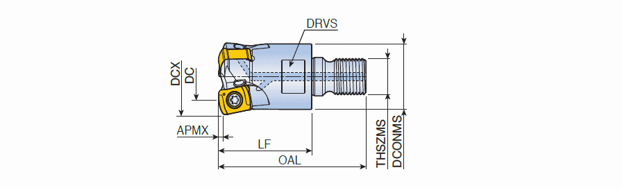 High feed end mills with BLMP 11 inserts of 4 cutting edges and T-FLEXTEC modular adaptations in maximum depth of cut ap 2.0 mm