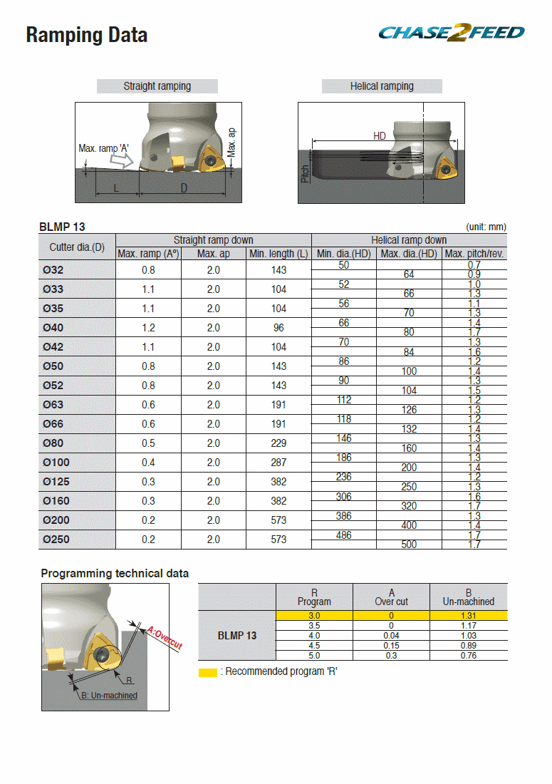 High feed end mills with BLMP 13 inserts of 6 cutting edges and T-FLEXTEC modular adaptations in max. Ap 2.0 mm