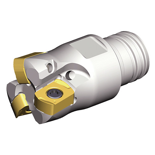 High feed end mills with BLMP 04 inserts of 4 cutting edges and MAXIRUSH modular adaptations in maximum depth of cut ap 0.5 mm