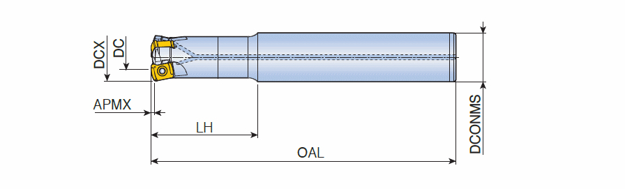 High feed end mills with BLMP 11 inserts of 4 cutting edges in maximum depth of cut ap 2.0 mm