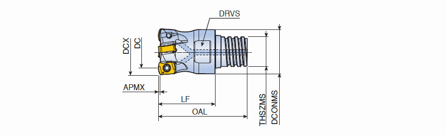 High feed end mills with BLMP 04 inserts of 4 cutting edges and MAXIRUSH modular adaptations in maximum depth of cut ap 0.5 mm