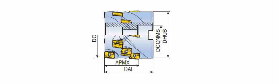 Extended flute shell mills with 4 helical cutting edges of double-sided inserts AN 11