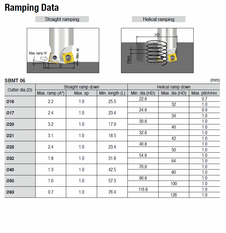 Application:, Facing, Helical Interpolation, High Feed Milling, Profiling, Rampdown, Unit: M