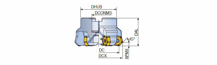 45° Face mills with double sided 12 cutting edges inserts HN 10 & screw clamping for general milling in max. depth of cut 6.35 mm