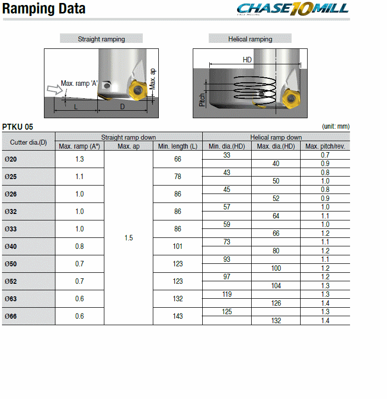 High Feed mills with PTKU 05 inserts of economical 10 cutting edges in maximum depth of cut ap 1.5 mm