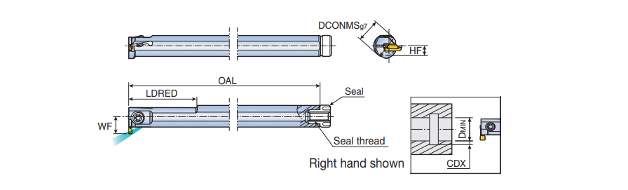 Boring bars with coolant hole for internal shallow grooving and turning on small diameter of Dmin = 12.5 mm with TDIM/P inserts