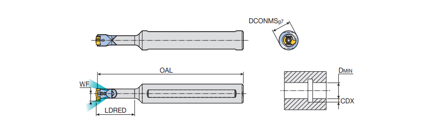 Solid carbide boring bars with coolant holes for internal shallow grooving on small diameter Dmin=10mm with TMIS 8 inserts