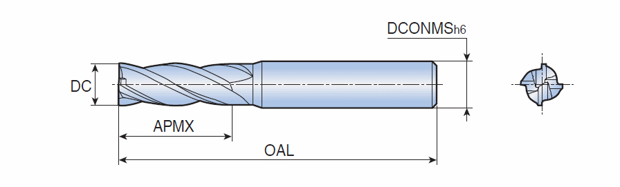 Solid carbide end mills with flat type & medium & 4 flute for general purpose of pre-hardened steels, tool steels, alloy steels and carbon steels