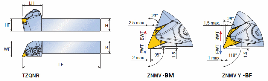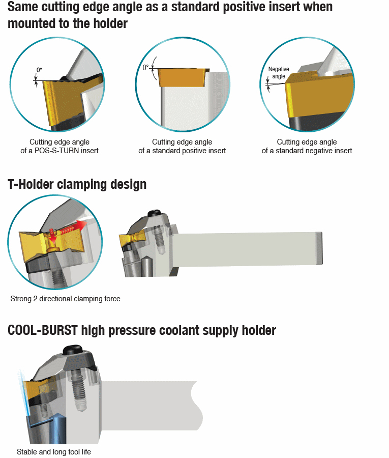 T-holders with unique clamping and ZNMV positive 4 corner inserts for multi directional and high feed turning