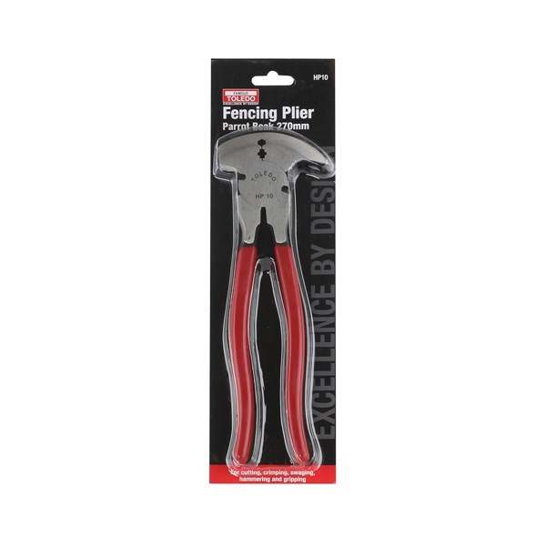 Designed for: Cutting, crimping, swaging, hammering, and gripping wire and staples used in fencing and farming applications Features: Two specially designed wire cutters, parrot lever assembly, serrated hammer and gripping zone, swager, and crimper Material: Drop forged alloy steel for superior strength and durability Handle: PVC dipped Jaw Opening: 0-32mm Jaw Width: 14.5mm Overall Length: 270mm