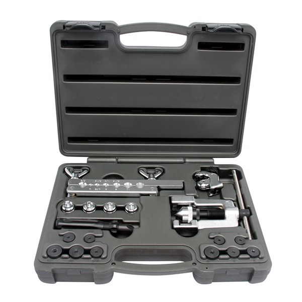 Comprehensive flaring tool kit covers all popular sizes and flare types and includes a tube cutter and deburr tool