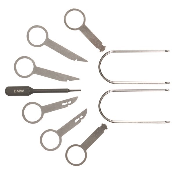 Handy and compact set of pocket sized tools for the safe and quick removal of radios from a range of vehicle makes including BMW, Ford, Mercedes-Benz, Volkswagen and Audi