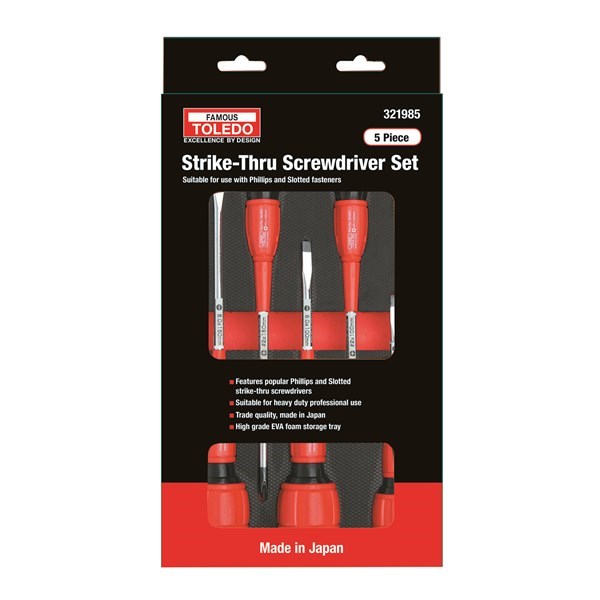 Set contains two Phillips and three Slotted Strike-Thru screwdrivers