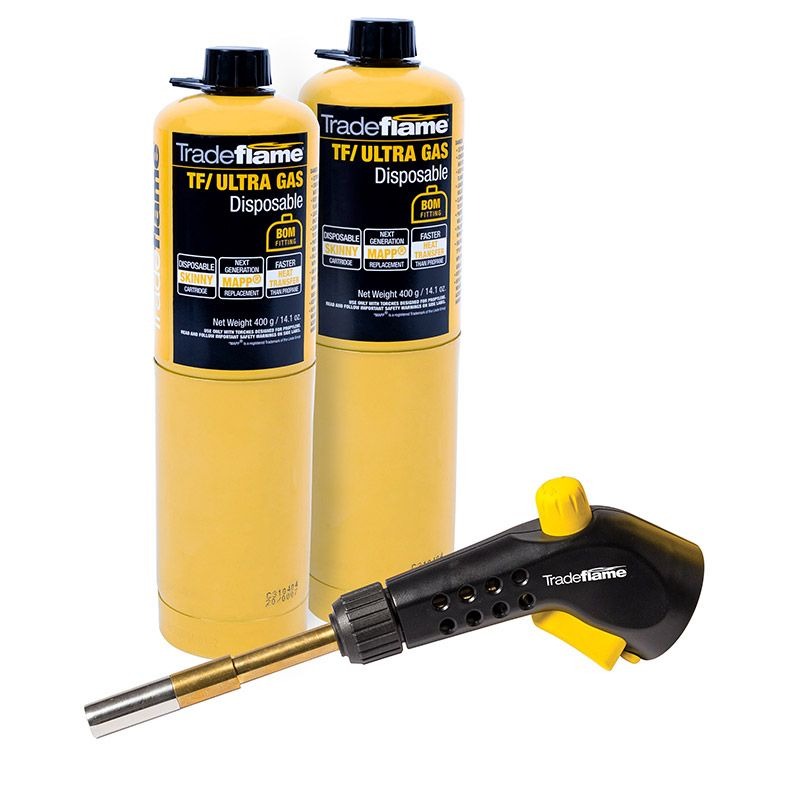 Using the readily available, high performance TF/ULTRA GAS cartridges, this kit meets the performance and reliability standards of the trade professional. Preferred over propane due to it’s faster heat transfer, these kits offer high performance and quality execution of any brazing, soldering or heating jobs.