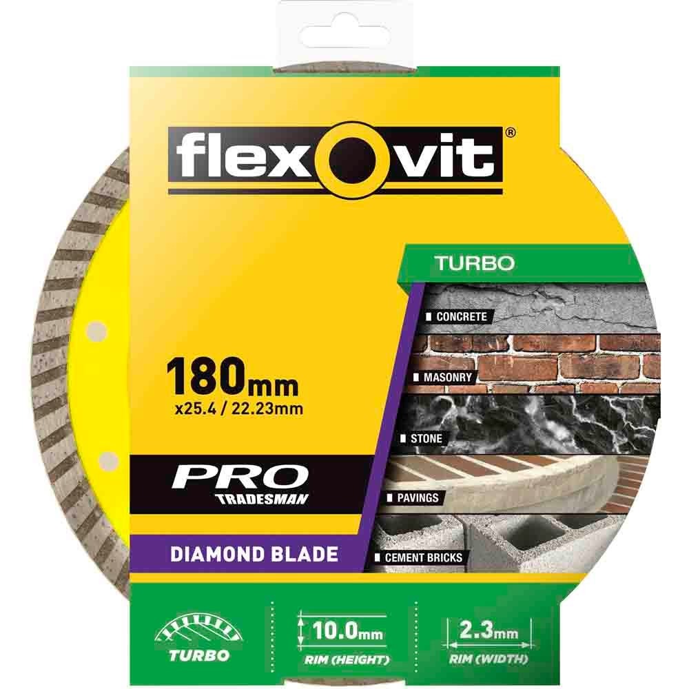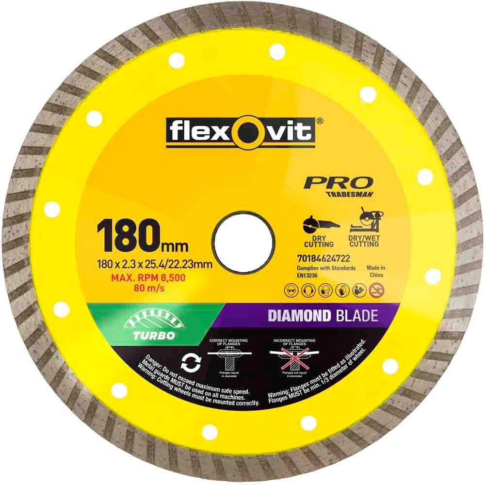 Home » Shop » CUTTING TOOLS (HSS & Carbide) » ABRASIVES » FLEXOVIT TURBO BLADES - FOR ANGLE GRINDER/ CIRCULAR SAW/ TILE SAW » FLEXOVIT TURBO 180 x 2.6 x 10 x 25/22mm CONCRETE/CLAY CUTTER FLEXOVIT