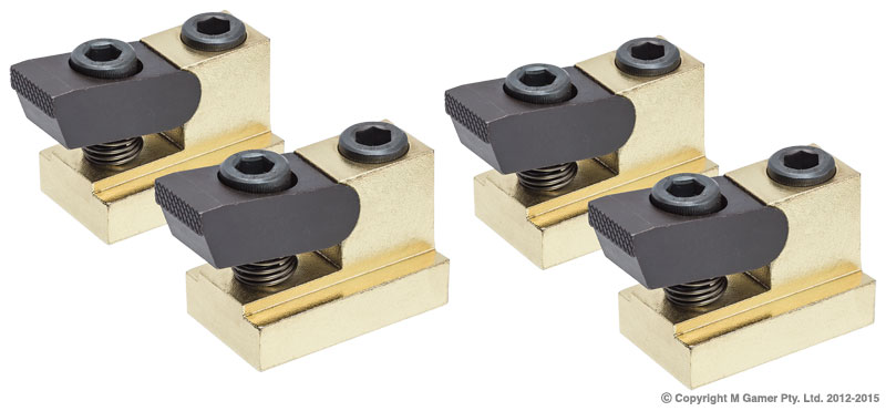 • Each set consists of four channel clamps • Ideal for thin workpieces • Strong clamping force • Quick setting • Suitable for light duty cutting or milling and can be used on EDM Machines Table slot: 15.5 mm Base width: 25 mm Base height: 10 mm Slot height: 20 mm Length45 mm