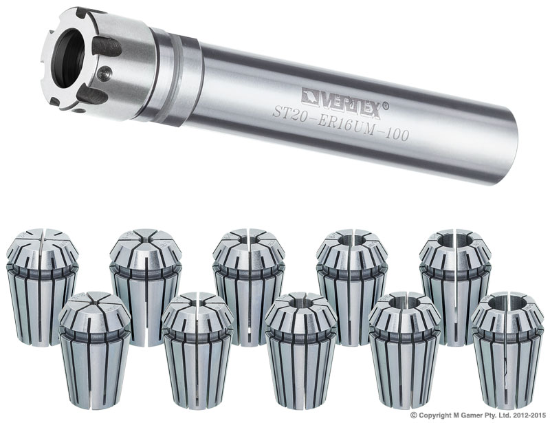 • Collet chuck set complete with a Straight shank collet chuck, collets and spanner in a blow mold case. Collet chucks are made to DIN2080 standard and the collet made to DIN6499 • The collet chuck is hardened and ground Shank: Mini 20×100 mm Collet: ER16 Range: 1-10 mm (10 Collets)