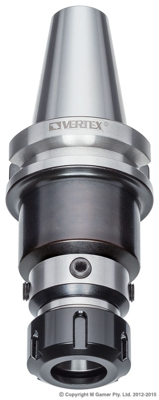 • Tension and compression tap holder • ER collet system for accurate tapping • Adjustable location plates for holding the tap square • Square shank of tap is secured by grub screws • Hardened and Ground Shank: BT40 Collet: ER32 Compression Distance: 6 mm Capacity: M3-M25