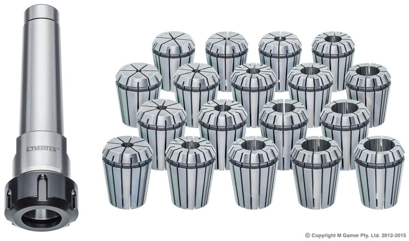 • Collet chuck set complete with a MT collet chuck, collets and spanner in a blow mold case Collet chucks are made to DIN2080 standard and the collet made to DIN6499 Taper: MT3 Spindle thread: M12 Collet: ER32 Range: 3-20 mm (18 Collets)