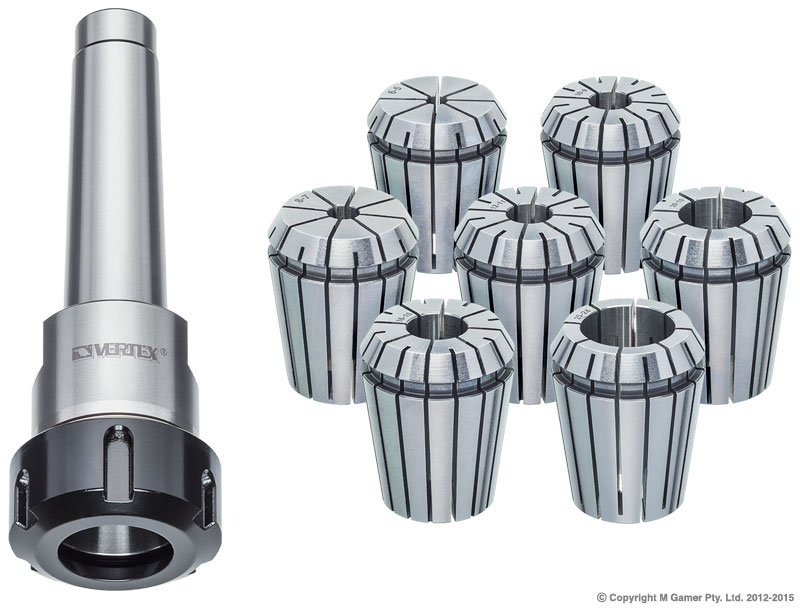 • Collet chuck set complete with a MT collet chuck, collets and spanner in a blow mold case Collet chucks are made to DIN2080 standard and the collet mount to DIN6499 • The collet chuck is hardened and ground Taper: MT4 Spindle thread: M16 Collet: ER40 (7 Piece)