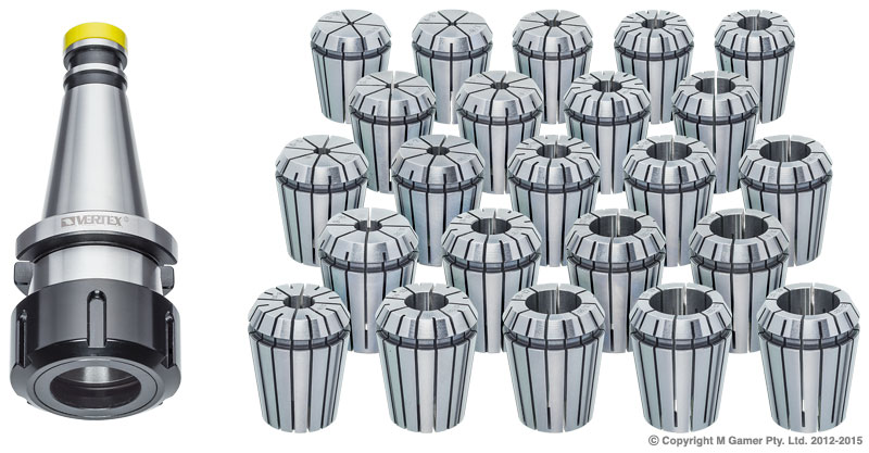 • Collet chuck set complete with National taper collet chuck, collets and spanner in a blow mold case • Collet chucks are made to DIN2080 standard and the collet made to DIN6499 • The collet chuck is hardened and ground Taper: NT40 Spindle Thread: M16 Collet: ER40 Range: 4-26 mm (23 Collets)