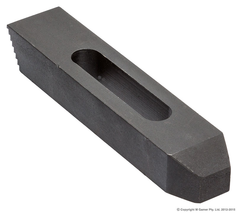 • Heat Treated Steel • Black Oxide Finish • HRC 37° Length: 150 mm Width: 38 mm Thickness: 22 mm Slot width: 18 mm Bolt size: M16 Tooth dimension: 3.1×1.8 mm